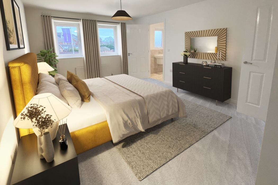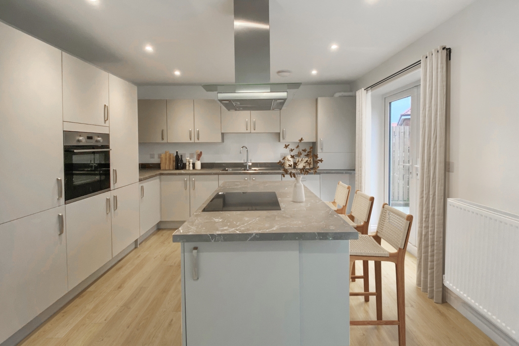 The space and style of this home is sure to appeal to growing families. The ground floor has a spacious hall, good size lounge to relax in, handy WC and the focal point of the home – an open-plan, multi-purpose kitchen/dining/family area which spans the width of the home. It has a striking bay window feature, plus two sets of French doors leading to the rear garden. There is also a desirable island feature. It really is perfect for entertaining family and friends. There are two storage cupboards off the hall to keep your home neat and tidy.